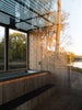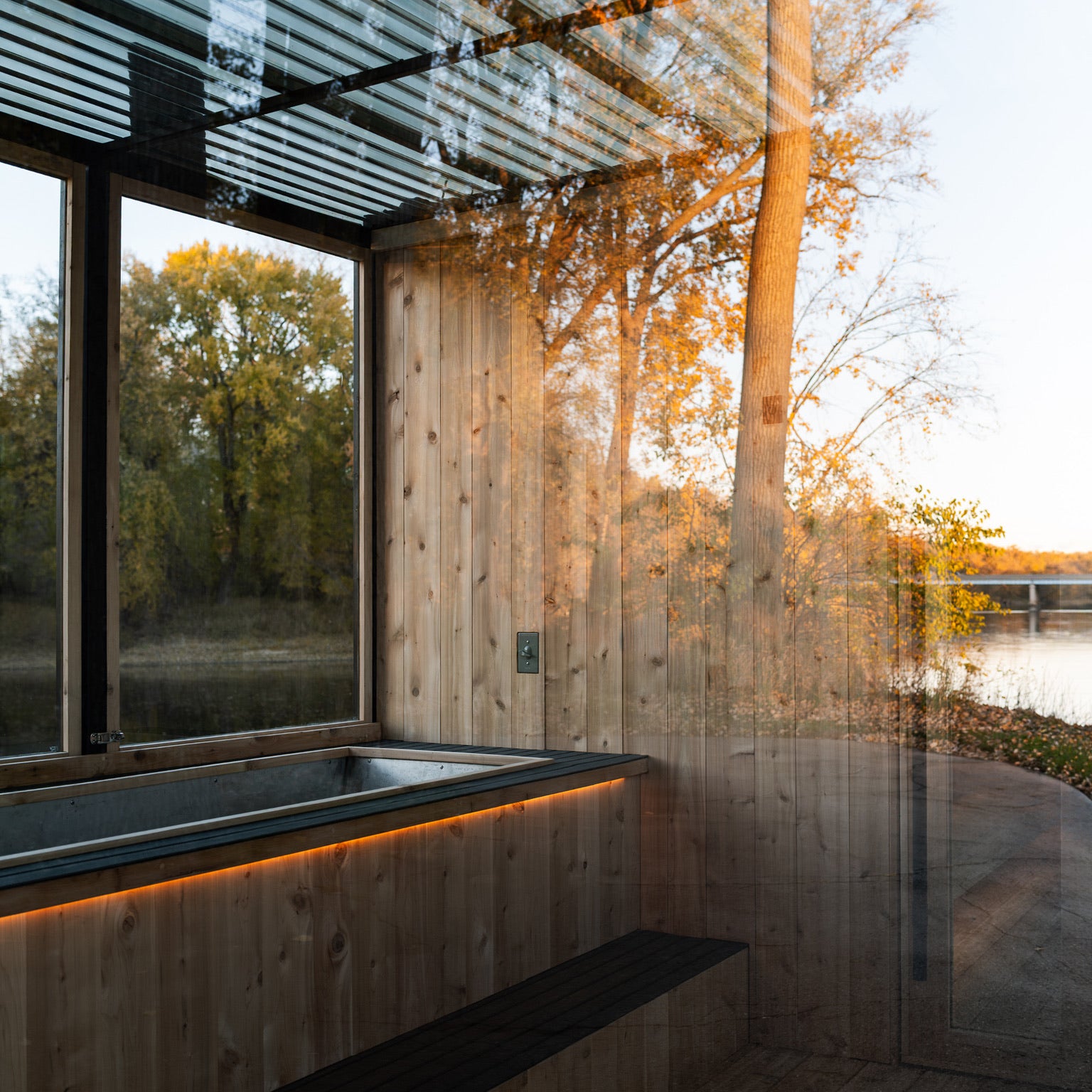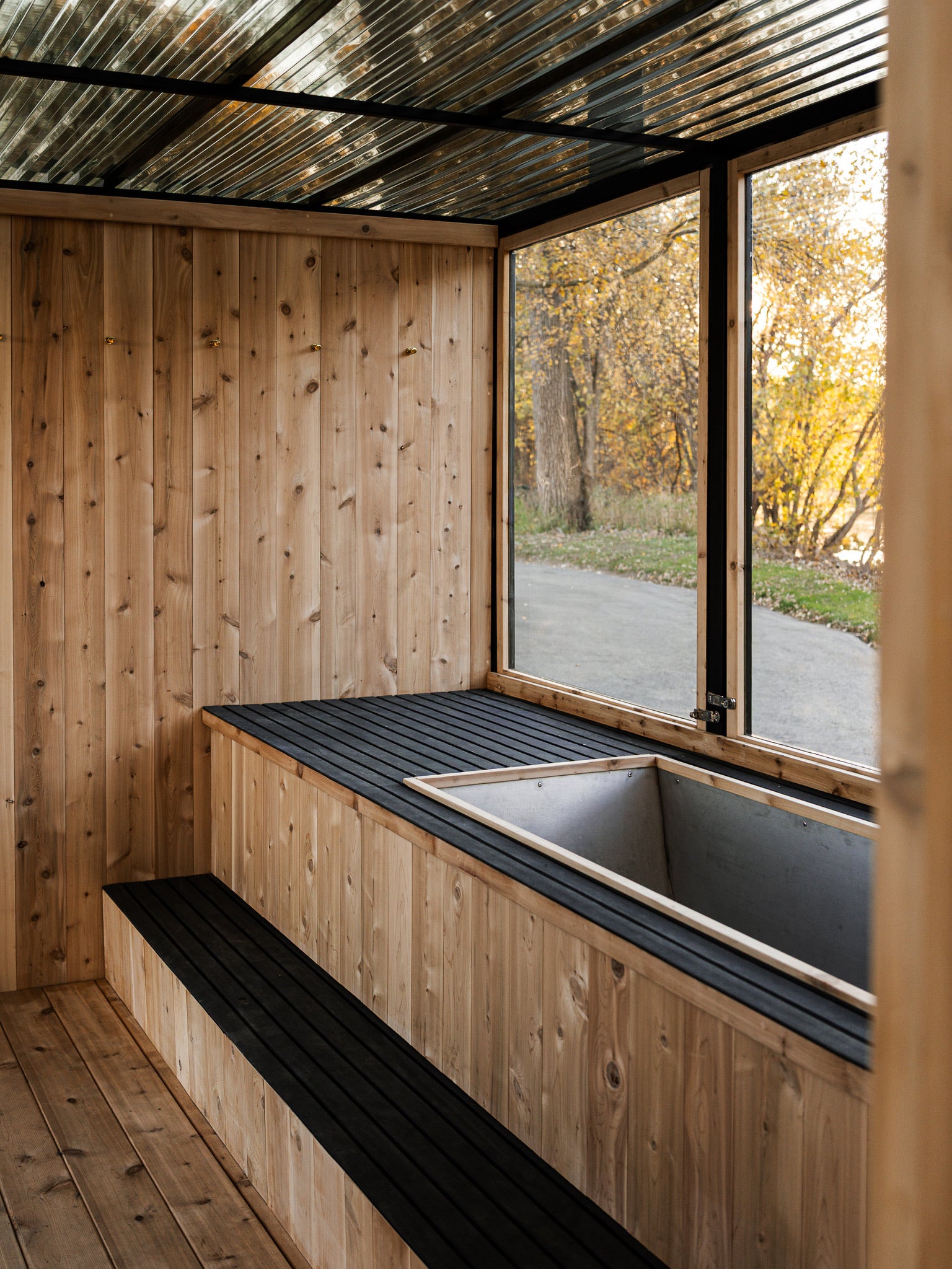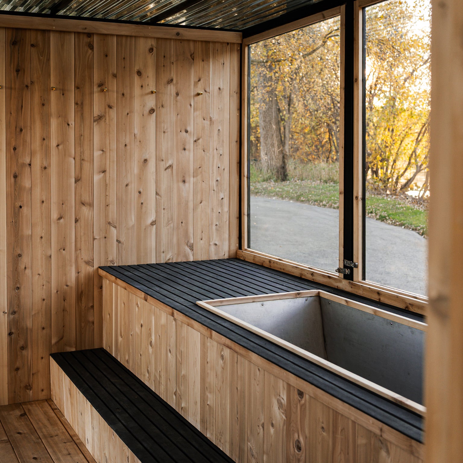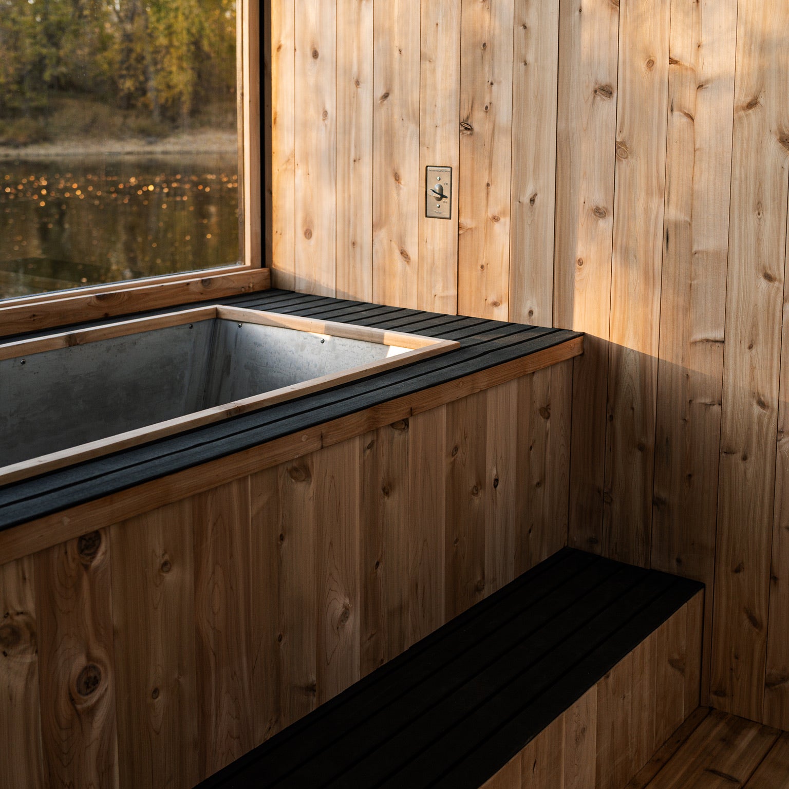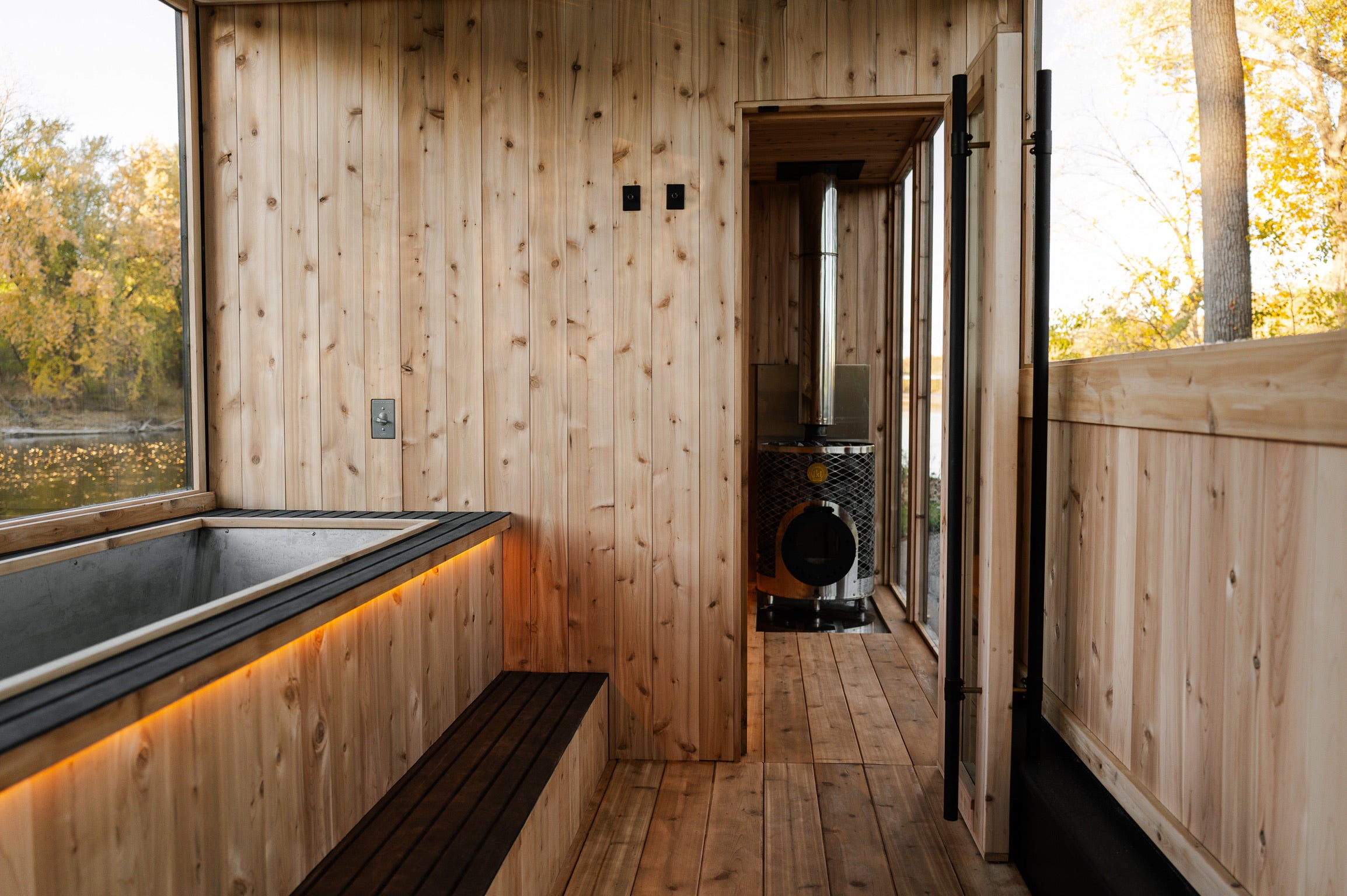Adjacent to the heat lies its essential counterpart: a dedicated cold plunge room featuring a custom-built Nightjar cold plunge large enough for two, set into slip-resistant composite decking. Under-glow step lighting guides the transition from standing to immersion. Three operable windows across the back wall and a large panoramic window opposite the plunge ensure ventilation and views, while the metal-framed glass door provides grand entry.